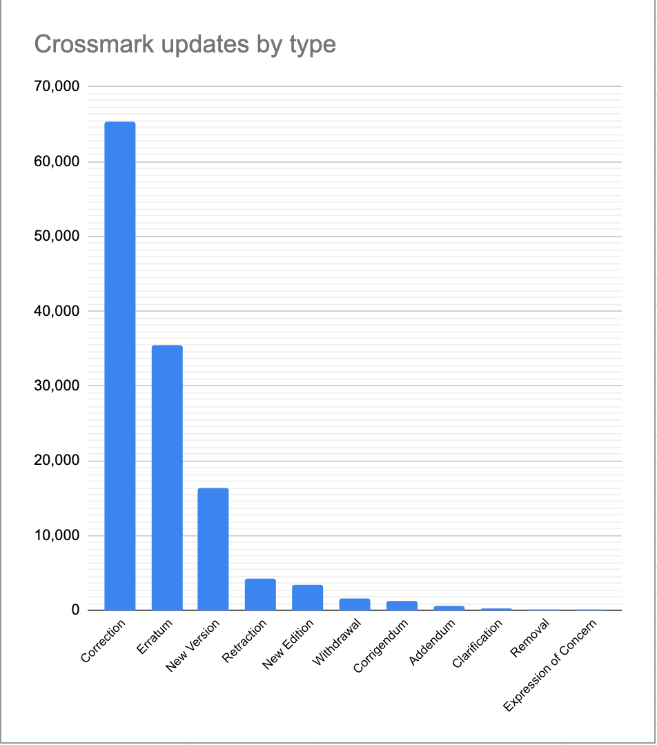 We know that there are many more corrections and retractions that are not yet being registered, and to address this, we are now asking all of our members to start registering metadata for significant updates to your publications, even if you don’t implement the Crossmark button and pop-up box on your content. Remember, anyone can access the Crossmark metadata through our public REST API, and start using it straight away - even if you’re not ready to implement the Crossmark button.
