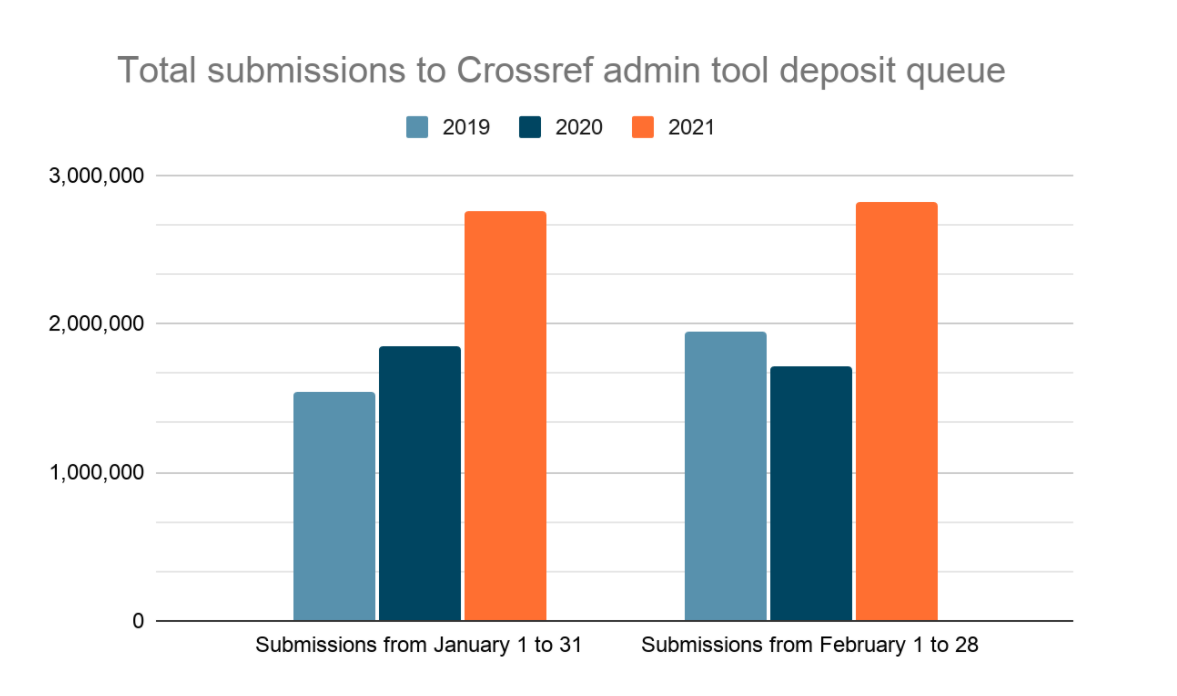 Januaries and Februaries are usually busy at Crossref. Journal ownership changes hands. Members migrate from one platform to another (and can need to update tens of thousands of their resolution URLs). And, many of you are registering your first issues, books, or conferences of the year. Others of you have heard the calls of The Initiative for Open Citations (I4OC) and The Initiative for Open Abstracts (I4OA) and are enriching your metadata accordingly (thank you!). Tickets into our support and membership colleagues peak for the year. But did we see significantly more submissions this year?