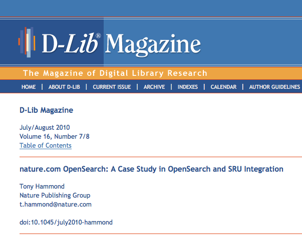 Since I’ve already blogged about this a number of times before here, I thought I ought to include a link to a fuller writeup in this month’s D-Lib Magazine of our nature.com OpenSearch service which serves as a case study in OpenSearch and SRU integration: