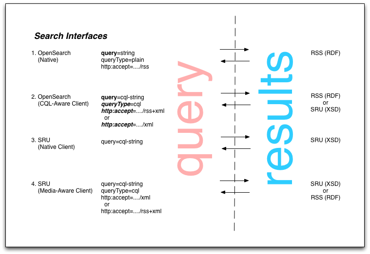 What I wanted to discuss here was the OpenSearch and SRU interfaces to a Search Web Service such as outlined in my previous post. The diagram at top of this post shows query forms for OpenSearch and SRU and associated result types. The Search Web Service is taken to be exposing an SRU interface. It might be simplest to walk through each of the cases.