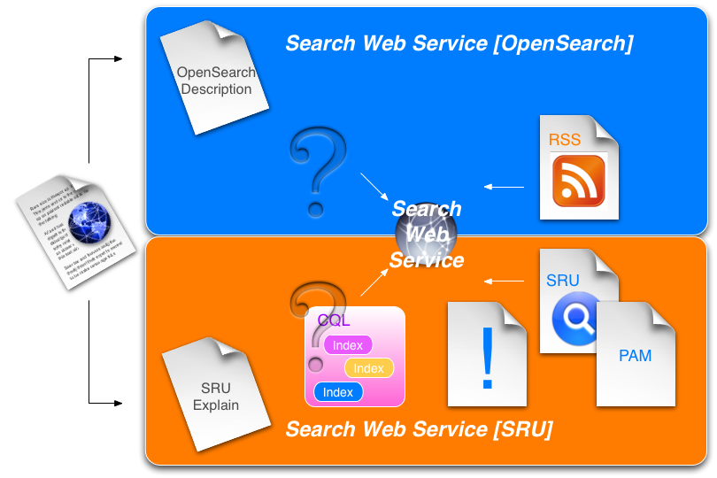 While the OASIS Search Web Services TC is currently working towards reconciling SRU and OpenSearch, I thought it would be useful to share here a simple graphic outlining how a search web service for structured search might be architected.